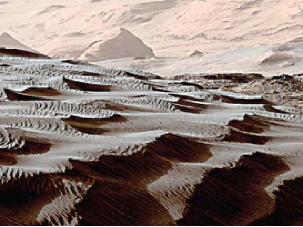 2) या ग्रहावर वाहणार्या वेगवान वार्यामुळे वाळूच्या टेकड्या तयार होणे, ही सामान्य बाब आहे. मात्र, मंगळावरील वल्से मारिनारिस व मेलम चस्मा दर्यांमधील वाळूच्या या टेकड्या नुकत्याच तयार झाल्या आहेत.
